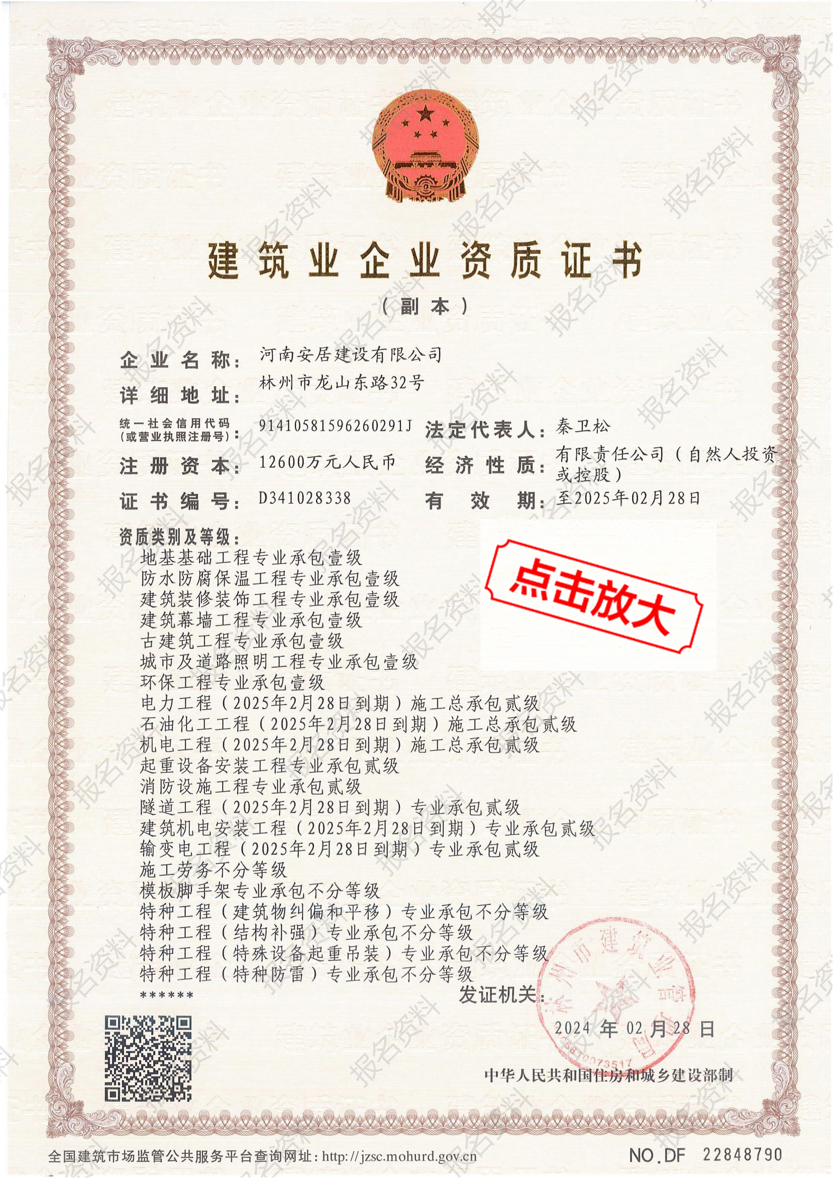 滔滔黃河哺育了中華民族拼搏向上的奮斗精神,巍巍太行造就了中原兒女的紅旗渠精神。百萬林州人下太行,鑄就了中國建筑之鄉(xiāng)響當(dāng)當(dāng)?shù)囊燮放啤:幽习簿咏ㄔO(shè)有限公司從誕生起血液里就流淌著紅色基因,秉承“安得廣夏千萬間,大庇天下寒士俱歡顏”的擔(dān)當(dāng)精神,用鋼筋混凝土筑起了高樓大廈,也用一流品質(zhì)、家國情懷打造了安居建設(shè)的輝煌成績。公司成立于2012年,注冊資金12600萬元,公司成立至今,擁有建筑,市政施工總承包等十項(xiàng)一級資質(zhì);其他二級等資質(zhì)共二十余項(xiàng)。公司秉承質(zhì)量第一,服務(wù)為主,堅(jiān)持垂直管理,從不設(shè)立分公司等分支機(jī)構(gòu)。